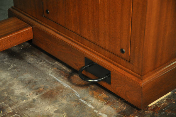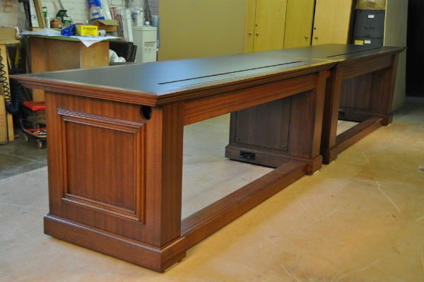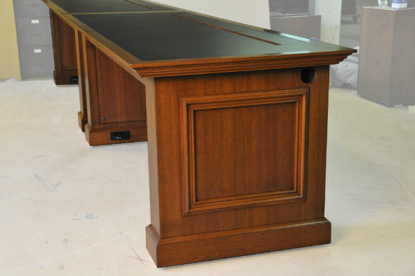 The top of the table is black Forbo, and the wood finish and detail match existing woodwork in the courtrooms
