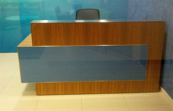 Custom reception desk featuring Walnut chassis to match architectural sample,