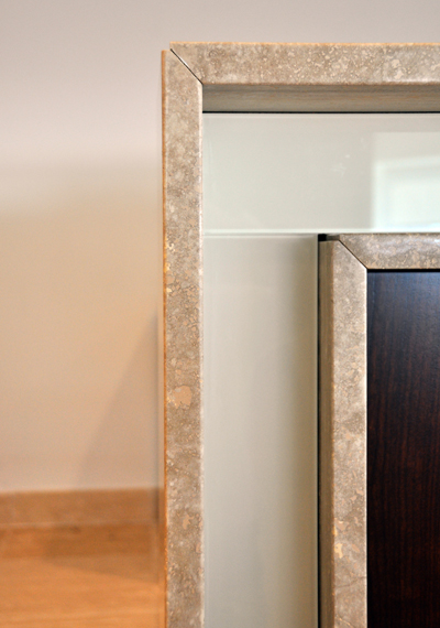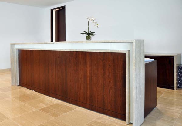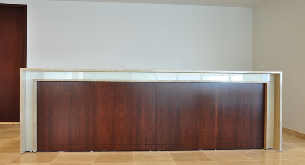 | This reception desk features quartered walnut wood, a saddle counter made of Travertine, and is accented with white back painted glass. |